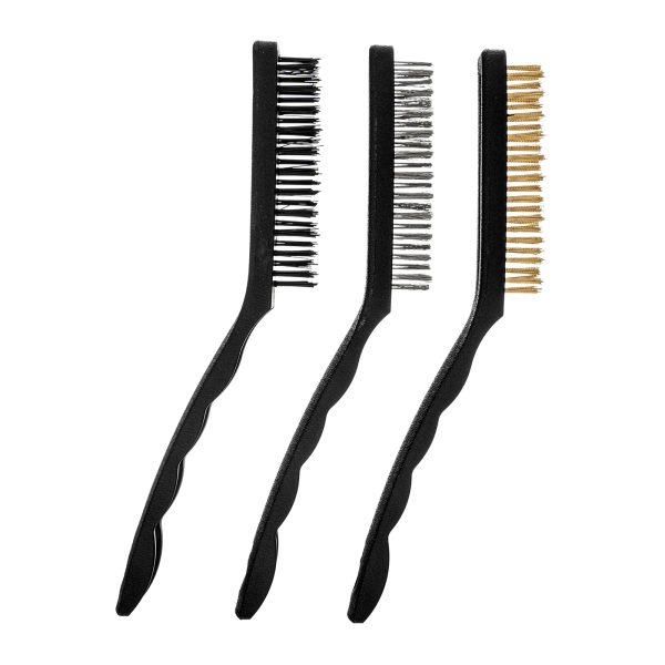 Набор из 3 больших щеток Matrix 74863 с пластмассовыми ручками предназначен для различных видов обработки — стальные удаляют ржавчину, загрязнения и старую краску с металлических и других поверхностей, а нейлоновая браширует и мягко очищает деревянные изделия. Набор пригодится во время ремонта, проведения кузовных работ, а также будет полезен в быту.