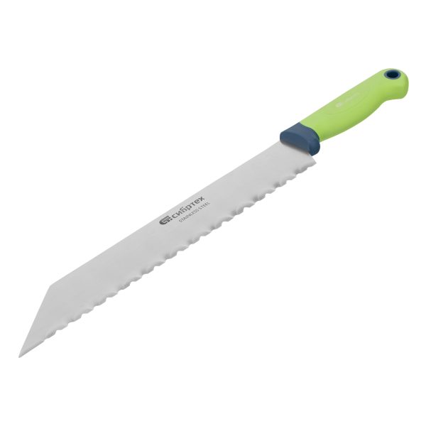 Нож Сибртех 79025 общей длиной 475 мм и длиной лезвия 340 мм, с обрезиненной рукояткой, предназначен для резки теплоизоляционных панелей. Он пригодится в ходе проведения строительных работ при укладке утеплителя. Лезвие длиной 340 мм легко справляется с резкой длинных и толстых пластов.