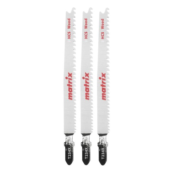 Полотна для электролобзика по дереву T234X Matrix 78217 с рабочей длиной 90 мм и шагом зубьев 2-3 мм, из стали HCS, — набор оснастки из 3 шт. Предназначены для распиловки древесных плит, ДСП и ДВП толщиной 2-65 мм. Устанавливаются на электролобзики, совместимые с оснасткой с Т-образным хвостовиком. Полотна используют во время проведения столярных или ремонтных работ.