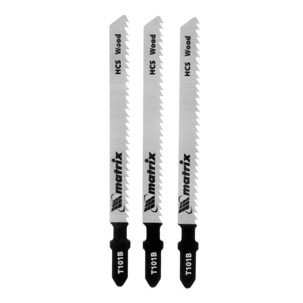 Полотна для электролобзика по дереву T101B Matrix 78201 с шагом зубьев 2,5 мм, из стали HCS, 3 шт. в упаковке, имеют рабочую длину 75 мм и входят в набор съемных элементов оснастки для пильного электроинструмента. Предназначены для прямого распила древесины, фанеры, ДСП, ДВП, пластика и эпоксидов. Толщина пропила составляет от 3 до 30 мм. Универсальный Т-образный хвостовик позволяет устанавливать полотна на большинство моделей электролобзиков ведущих производителей. Полотна используются для проведения столярных работ.