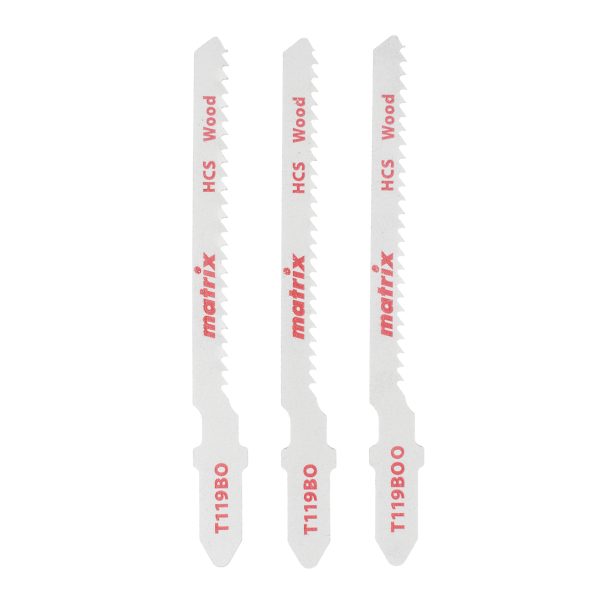 Полотна по дереву Matrix 78227, T119BO, 50 х 2 мм, из стали HCS, — набор оснасток для электролобзика из 3 шт., предназначенных для фигурного реза древесины, ДСП, фанеры и пластика толщиной 2-15 мм. Пилки совместимы с большинством современных электролобзиков, оснащенных зажимами под Т-образный хвостовик. Пригодятся для столярных работ и занятий творчеством.