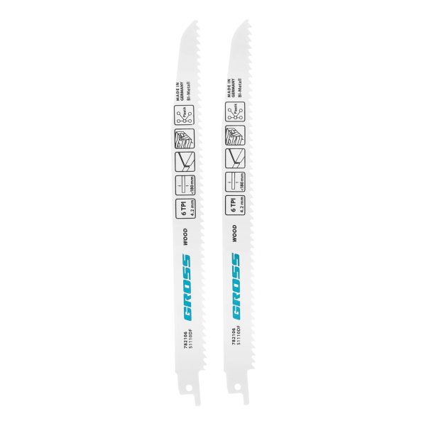 Полотна по дереву Gross 782106, 4444 — S1110DF, 210 x 4,2 мм, 2 шт., предназначены для установки на сабельную пилу. Они оптимальны для демонтажа изделий из дерева: мебели, окон, ограждений и различных конструкций. Увеличенная толщина 1,57 мм обеспечивает высокую надежность полотен, поэтому они рассчитаны на профессиональное применение.