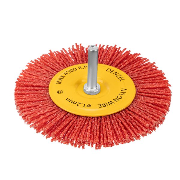 Плоская щетка Denzel 74434 диаметром 100 мм, со шпилькой и нейлоновой щетиной, — насадка для дрели, предназначенная для выполнения шлифовальных работ по пластику, древесине, стали и цветным металлам. Щетина изготовлена из высококачественного нейлона с нанесенным абразивом из оксида алюминия. Щетка оптимальна для деликатного удаления загрязнений, краски, пятен ржавчины с твердых поверхностей. Позволяет придать шероховатость поверхности, подходит для браширования древесины. Благодаря плоской форме насадка удобна для обработки пазов, изгибов и угловых соединений.