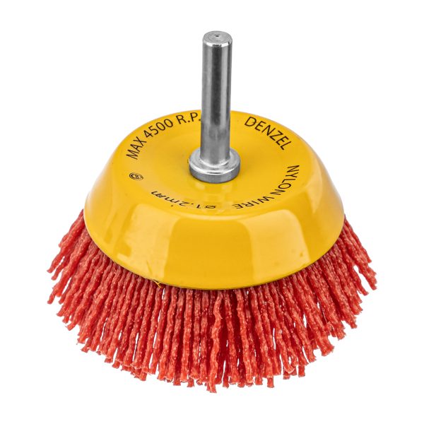 Щетка Denzel 74436 в форме чашки диаметром 75 мм, со шпилькой и нейлоновой щетиной, — насадка для дрели, предназначенная для выполнения шлифовальных работ по пластику, древесине, стали и цветным металлам. Щетина изготовлена из высококачественного нейлона с нанесенным абразивом из оксида алюминия. Щетка оптимальна для деликатного удаления загрязнений, краски, пятен ржавчины с твердых поверхностей. Позволяет придать шероховатость поверхности, подходит для браширования древесины. Насадка удобна для обработки плоских деталей большой площади.