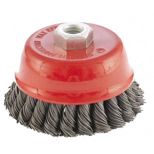 Двухрядная щетка Matrix «Чашка» 74687 диаметром 100 мм, с щетиной из крученой проволоки толщиной 0,8 мм, устанавливается на вал углошлифовальной машины с помощью гайки М14. Рекомендованная максимальная скорость вращения — до 8500 об/мин. Оснастка оптимальна для грубой (черновой) обработки: снятия старого слоя лакокрасочного покрытия и ржавчины, удаления загрязнений, зачистки сварных швов. Эффективно справляется с зачисткой больших поверхностей, подходит для выполнения работ повышенной сложности.