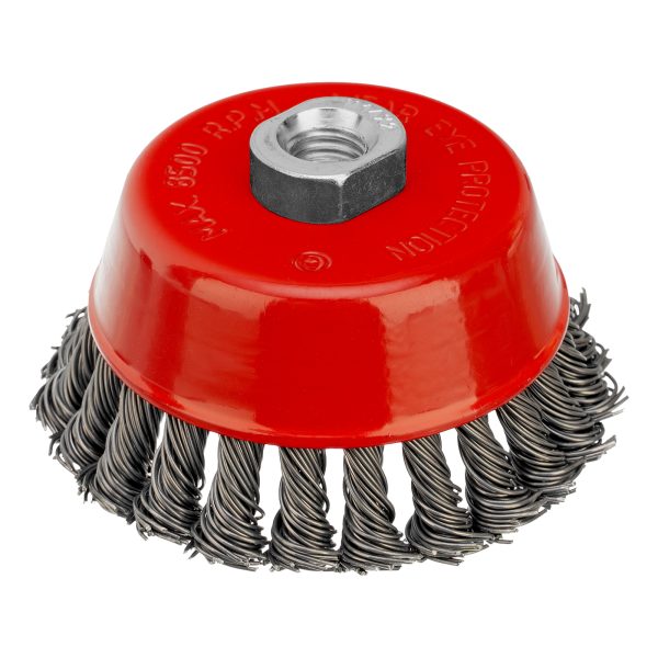 Щетка Matrix «Чашка» 74623 диаметром 100 мм, с присоединительной резьбой М14, с щетиной из крученой проволоки диаметром 0,8 мм, устанавливается на УШМ, поддерживающую работу со скоростью 8500 об/мин. Щетина предназначена для грубой (черновой) обработки поверхностей, более агрессивной по сравнению с щетиной 0,5 мм. Изделие подходит для удаления загрязнений, снятия толстого слоя ржавчины, ЛКМ, зачистки сварных швов.