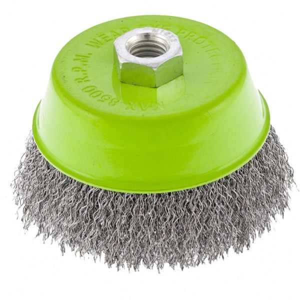 Щетка для УШМ Сибртех «чашка» 746057, М14, диаметром 100 мм, с щетиной из витой проволоки 0,3 мм, предназначена для постепенного снятия тонкого слоя материала с металлических, деревянных и пластиковых поверхностей. Удаляет ржавчину, загрязнения, а также остатки краски и других покрытий. Подходит для обработки участков значительной площади. Щетку устанавливают на вал углошлифовальной машины (УШМ), рекомендуемая максимальная скорость вращения 8500 об/мин. Работать с оснасткой следует в спецодежде.
