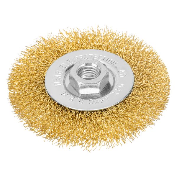Плоская щетка Matrix 74650 диаметром 100 мм, с щетиной из латунированной витой проволоки, крепится к валу УШМ с помощью гайки М14. Используется для щадящей обработки поверхностей, снятия тонкого слоя ржавчины, лакокрасочных покрытий, удаления въевшихся загрязнений. Плоской щеткой удобно работать в труднодоступных местах: углах и изгибах. При эксплуатации на рекомендованной скорости 4500 об/мин оснастка прослужит долго.