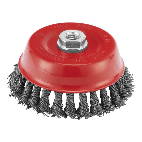 Щетка Matrix «Чашка» 74625 диаметром 125 мм, с присоединительной резьбой М14, с щетиной из крученой проволоки диаметром 0,8 мм, устанавливается на УШМ, поддерживающую работу со скоростью 6500 об/мин. Щетина предназначена для грубой (черновой) обработки поверхностей, более агрессивной по сравнению с щетиной 0,5 мм. Изделие подходит для удаления загрязнений, снятия толстого слоя ржавчины, ЛКМ, зачистки сварных швов.