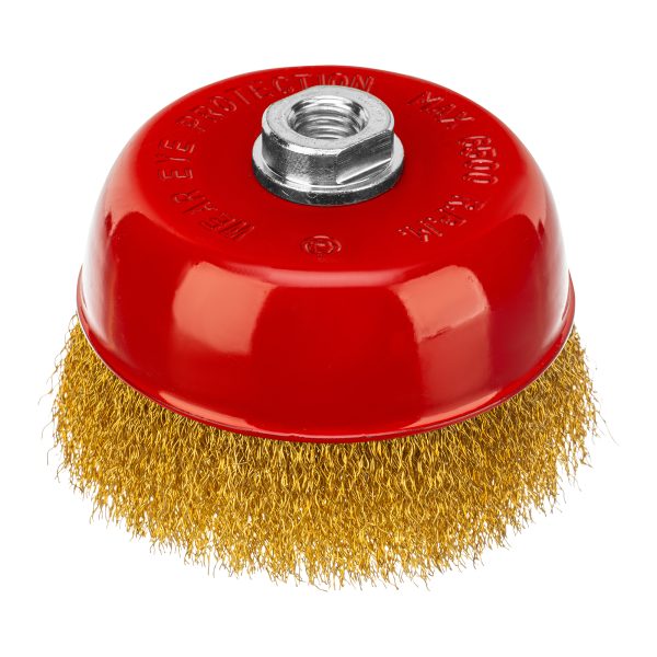 Щетка «чашка» Matrix 74606 диаметром 125 мм, с щетиной из латунированной витой проволоки, устанавливается на вал УШМ с помощью гайки М14. Предназначена для снятия тонкого слоя краски или лака, удаления ржавчины и загрязнений. При рекомендованной скорости вращения 6500 об/мин щеткой можно быстро обрабатывать участки большой площади.