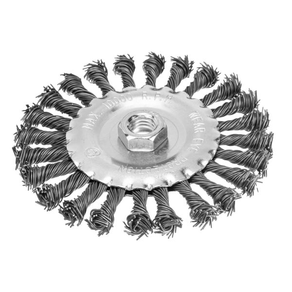 Плоская щетка Matrix 74644 диаметром 125 мм, с щетиной из крученой проволоки толщиной 0,8 мм и гайкой М14, — оснастка для УШМ, предназначенная для грубой (черновой) обработки поверхностей. Максимально допустимая скорость вращения шпинделя — 10000 об/мин. Щетка позволяет снять толстый слой ржавчины, лакокрасочных покрытий, загрязнений, а также зачистить сварные швы. Плоская форма удобна для обработки углов, изгибов и других труднодоступных мест.