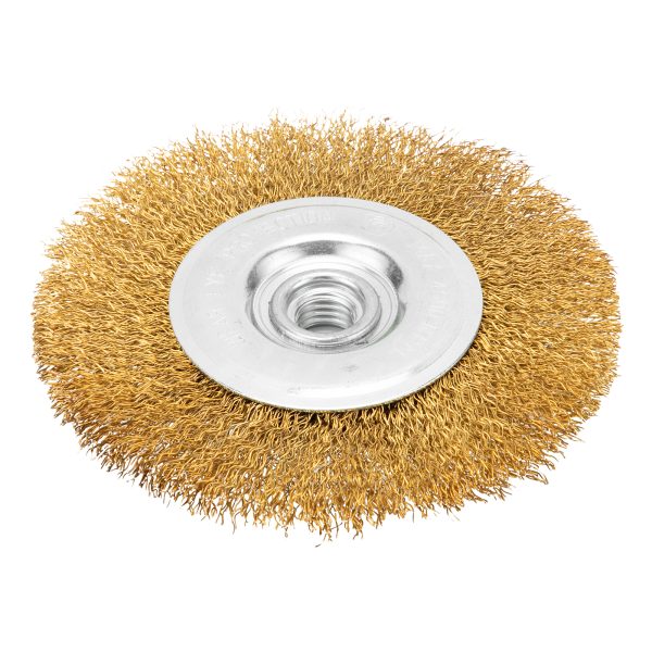 Плоская щетка Matrix 74651 диаметром 125 мм, с щетиной из латунированной витой проволоки, крепится к валу УШМ с помощью гайки М14. Используется для щадящей обработки поверхностей, снятия тонкого слоя ржавчины, лакокрасочных покрытий, удаления въевшихся загрязнений. Плоской щеткой удобно работать в труднодоступных местах: углах и изгибах. При эксплуатации на рекомендованной скорости 6500 об/мин оснастка прослужит долго.