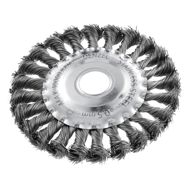 Плоская щетка для УШМ Denzel 746323 диаметром 125 мм, с посадкой 22,2 мм, с щетиной из крученой нержавеющей проволоки 0,5 мм, предназначена для снятия толстого верхнего слоя с металлических, деревянных, бетонных поверхностей. Удаляет загрязнения, ржавчину, старые лакокрасочные покрытия, заусенцы, окалину с ровных поверхностей и в труднодоступных местах. Оптимальна для обработки изделий из нержавеющей стали, а также зачистки сварных швов. Щетку устанавливают на фланец углошлифовальной машины, что удобно для выполнения большого объема работ, не требующих частой смены насадок. Рекомендуемая максимальная скорость вращения 10000 об/мин. Во время работы обязательно использование средств индивидуальной защиты. Щетка будет полезна на строительной площадке, производственном предприятии, а также пригодится в быту.
