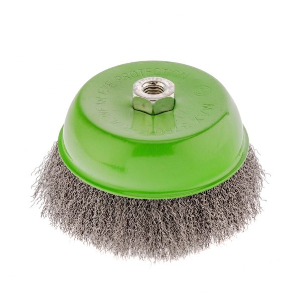 Щетка для УШМ Сибртех «чашка» 746077, М14, диаметром 150 мм, с щетиной из витой проволоки 0,3 мм, предназначена для постепенного снятия тонкого слоя материала с металлических, деревянных и пластиковых поверхностей. Удаляет ржавчину, загрязнения, а также остатки краски и других покрытий. Подходит для обработки участков значительной площади. Щетку устанавливают на вал углошлифовальной машины (УШМ), рекомендуемая максимальная скорость вращения 6500 об/мин. Работать с оснасткой следует в спецодежде.