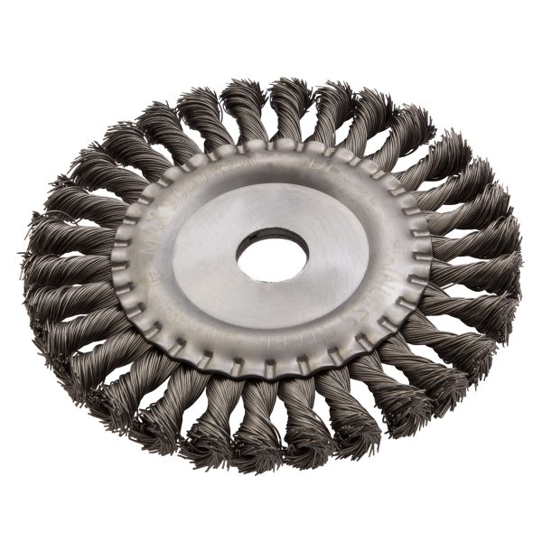 Плоская щетка для УШМ Denzel 746343 диаметром 150 мм, с посадкой 22,2 мм, с щетиной из крученой нержавеющей проволоки 0,5 мм, предназначена для снятия толстого верхнего слоя с металлических, деревянных, бетонных поверхностей. Удаляет загрязнения, ржавчину, старые лакокрасочные покрытия, заусенцы, окалину с ровных поверхностей и в труднодоступных местах. Оптимальна для обработки изделий из нержавеющей стали, а также зачистки сварных швов. Щетку устанавливают на фланец углошлифовальной машины, что удобно для выполнения большого объема работ, не требующих частой смены насадок. Рекомендуемая максимальная скорость вращения 9000 об/мин. Во время работы обязательно использование средств индивидуальной защиты. Щетка будет полезна на строительной площадке, производственном предприятии, а также пригодится в быту.