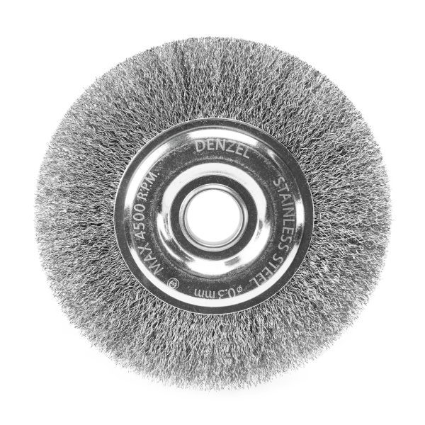 Плоская щетка для УШМ Denzel 746643 диаметром 150 мм, с щетиной из витой нержавеющей проволоки 0,3 мм, с посадкой 22,2 мм, постепенно снимает тонкий слой материала, поэтому ее используют для щадящей обработки металлических, деревянных, пластиковых поверхностей, а также изделий из нержавеющей стали. Щетка удаляет ржавчину, загрязнения, остатки лакокрасочных покрытий из труднодоступных мест, пазов и углов. Оснастка с посадкой 22,2 мм устанавливается на фланец углошлифовальной машины, что удобно для длительной работы без смены насадок. Рекомендуемая максимальная скорость вращения составляет 4500 об/мин. Во время работы следует использовать средства индивидуальной защиты. Щетку применяют в строительстве, машиностроении, а также в быту.