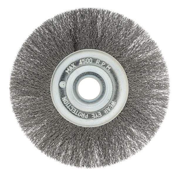 Плоская щетка для УШМ Сибртех 746667 диаметром 175 мм, с посадкой 22,2 мм, с щетиной из витой проволоки, предназначена для щадящей очистки твердых поверхностей от загрязнений, ржавчины, остатков краски и других покрытий. Щетина из проволоки толщиной 0,3 мм постепенно снимает тонкий слой материала. Плоская форма щетки делает ее оптимальным инструментом для обработки внутренних углов, пазов, изгибов и малодоступных мест. Щетка позволяет придать шероховатость или подчеркнуть структуру материала. Насадка устанавливается на фланец углошлифовальной машины и подходит для продолжительной работы, не требующей частой смены оснасток. Рекомендуемая максимальная скорость вращения составляет 4500 об/мин. Для обеспечения безопасности оператора следует использовать средства индивидуальной защиты. Щетка применяется в строительной, производственной сфере, а также в быту.