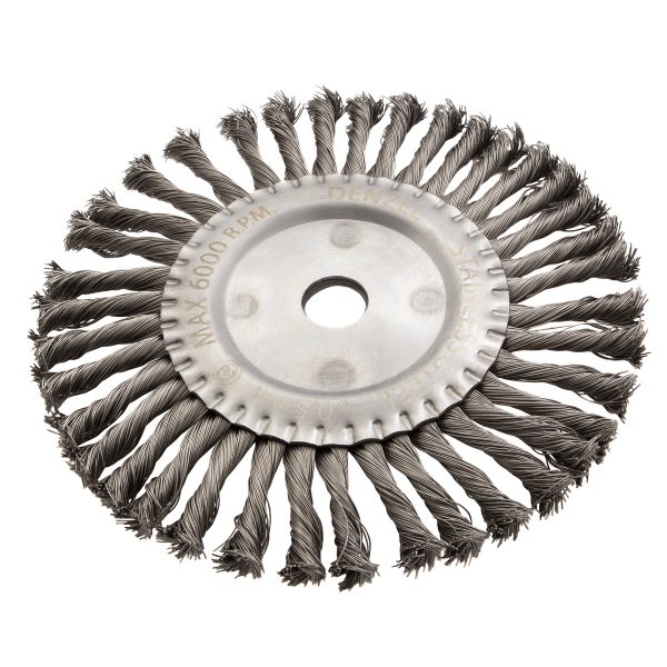 Плоская щетка для УШМ Denzel 746383 диаметром 200 мм, с посадкой 22,2 мм, с щетиной из крученой нержавеющей проволоки 0,5 мм, предназначена для снятия толстого верхнего слоя с металлических, деревянных, бетонных поверхностей. Удаляет загрязнения, ржавчину, старые лакокрасочные покрытия, заусенцы, окалину с ровных поверхностей и в труднодоступных местах. Оптимальна для обработки изделий из нержавеющей стали, а также зачистки сварных швов. Щетку устанавливают на фланец углошлифовальной машины, что удобно для выполнения большого объема работ, не требующих частой смены насадок. Рекомендуемая максимальная скорость вращения 6000 об/мин. Во время работы обязательно использование средств индивидуальной защиты. Щетка будет полезна на строительной площадке, производственном предприятии, а также пригодится в быту.