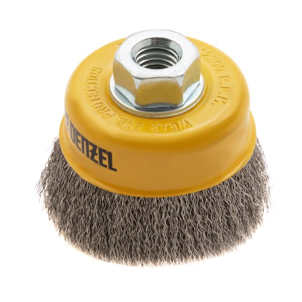 Щетка для УШМ «Чашка» Denzel 746043 с гайкой М14, диаметром 75 мм, с щетиной из витой нержавеющей проволоки диаметром 0,3 мм, позволяет быстро и аккуратно очистить металлическую, деревянную или пластиковую поверхность от незначительных загрязнений и ржавчины, а также удалить остатки лакокрасочных материалов, сделать поверхность шероховатой или матовой. Насадка предназначена для очистки плоских участков большой площади. Подходит для обработки нержавеющей стали.