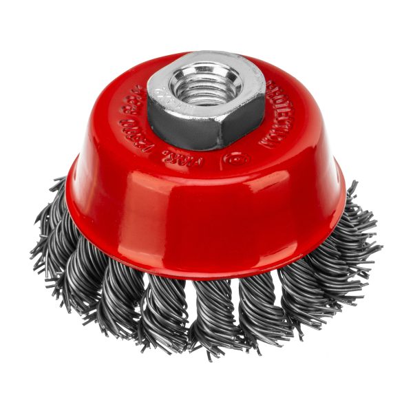 Щетка Matrix «Чашка» 74622 диаметром 75 мм, с присоединительной резьбой М14, с щетиной из крученой проволоки диаметром 0,8 мм, устанавливается на УШМ, поддерживающую работу со скоростью 12500 об/мин. Щетина предназначена для грубой (черновой) обработки поверхностей, более агрессивной по сравнению с щетиной 0,5 мм. Изделие подходит для удаления загрязнений, снятия толстого слоя ржавчины, ЛКМ, зачистки сварных швов.