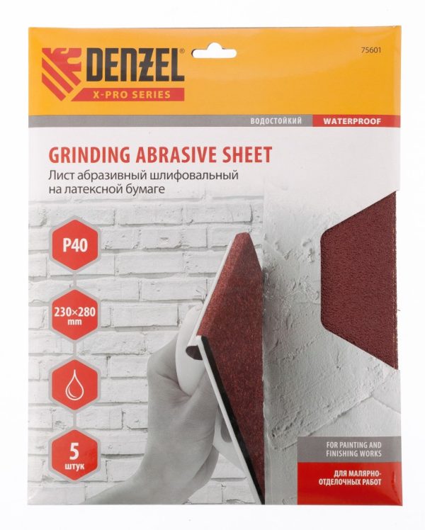 Шлифлист на бумажной основе Denzel Р40 арт. 75601 применяется для выравнивания шпатлеванных и оштукатуренных поверхностей на основе гипсовых и известковых составов, а также для обработки дерева, металла, пластика, удаления ржавчины, загрязнений, заусенцев, старых лакокрасочных покрытий.,Абразив Р40 с крупными зернами 400-500 мкм легко справится с грубой (черновой) обработкой поверхностей.