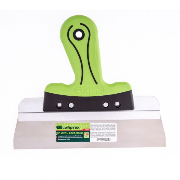 Фасадный шпатель Сибртех 85582 с рабочим полотном шириной 250 мм из нержавеющей стали и 2-компонентной рукояткой предназначен для нанесения, выравнивания и сглаживания отделочных составов, а также проведения других ремонтно-отделочных работ. Инструмент оптимально подходит для заглаживания зашпаклеванных швов.