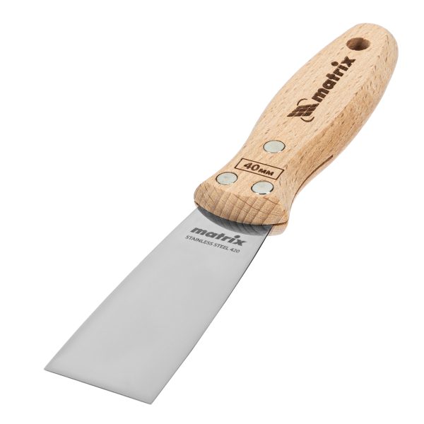 Шпательная лопатка Matrix 85610 с полотном из нержавеющей стали шириной 40 мм и буковой рукояткой предназначена для работы со строительными растворами. Применяется для нанесения различных смесей на поверхности, шпатлевания трещин и неровностей.
