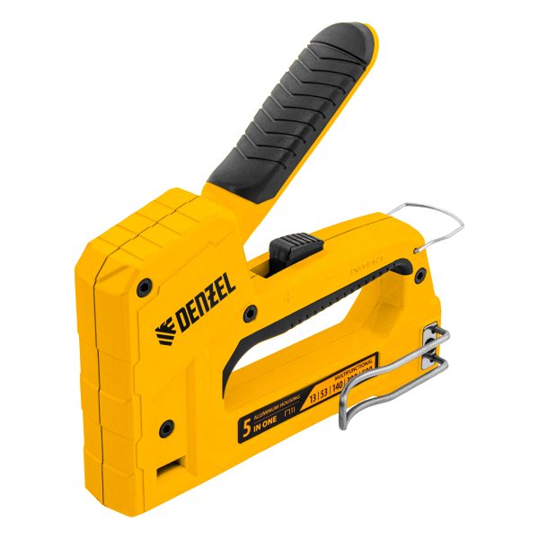 Мебельный степлер Denzel 40215 совместим со скобами типа 53 и 13 размером 6-14 мм, типа 140 размером 10-14 мм, а также с гвоздями типа 300 размером 15 мм и штифтами типа 500 размером 15 мм. Предназначен для фиксации листовых материалов на деревянном основании. Используется для крепления фанеры, ДСП, ДВП, картона, оргалита, изоляционного материала, а также для укладки напольных покрытий, обивки мебели и выполнения багетных работ.