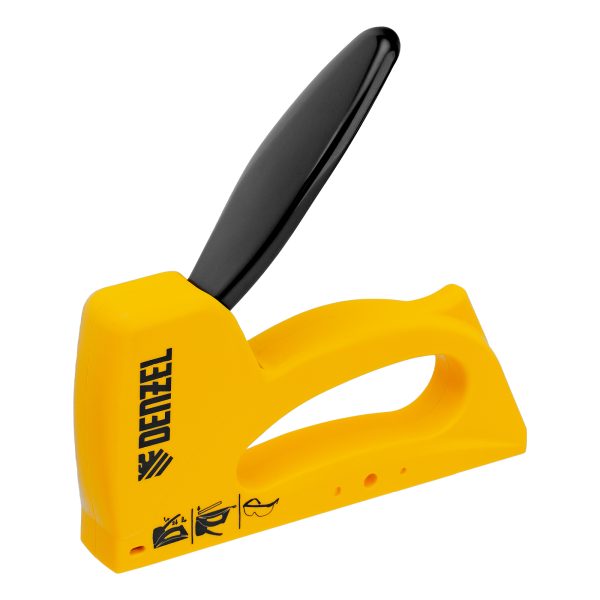 Пластиковый степлер Denzel 40221 работает со скобами типа 53 размером 6-10 мм и предназначен для быстрого крепления листовых материалов к основаниям из древесины, ДВП или ДСП. Используется для сборки и обивки мебели, фиксации изоляционных материалов. Ударный механизм рессорного типа не требует повышенных усилий от пользователя, поэтому продолжительная работа с инструментом не вызывает дискомфорт.