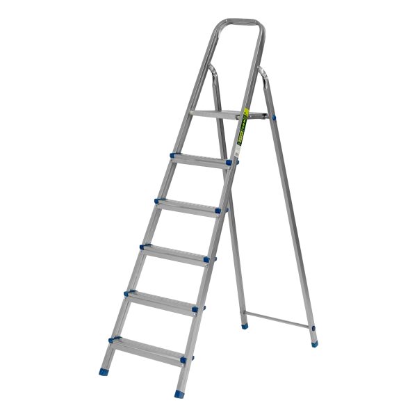 Стальная оцинкованная стремянка Сибртех 97838 с 6 ступенями позволяет повесить полку, картину или шкафчик, достать нужный предмет и решить другие задачи, для которых требуется доступ к предметам на высоте. Рама и ступени из стального профиля выдерживают вес до 120 кг. Расстояние от опорной поверхности до площадки составляет 121 см, при среднем росте пользователя 170 см рабочая высота лестницы — 321 см. Необходимо соблюдать технику безопасности: размещать стремянку только на ровной плоскости и не использовать ее для работы с дрелью, шуруповертом и другим электроинструментом.