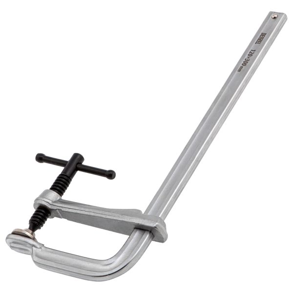 Кованая F-образная струбцина Denzel 20477 с глубиной зажима 120 мм, усиленная, предназначена для фиксации деталей шириной до 300 мм и материалов при проведении слесарных, столярных и сварочных работ. Тавровый профиль обеспечивает устойчивость конструкции к изгибу, что позволяет фиксировать детали со значительным усилием. Струбцина подходит для профессионального применения.