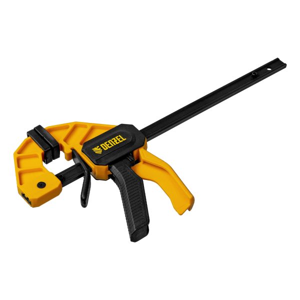 - Комфортное использование — струбцина весит всего 290 г, обрезиненная кнопка фиксации обеспечивает удобный захват.