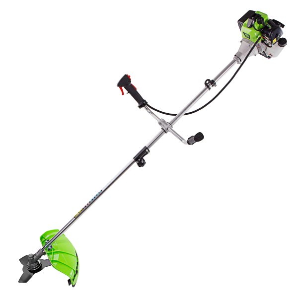 Бензиновый триммер Сибртех КС-1800Р 962525 с разъемной штангой, поставляющийся комплектом из 2 частей, имеет двигатель объемом 33 куб. см и мощностью 1,8 л. с., благодаря чему успешно справляется с подравниванием газона, скашиванием травы на лужайке и уничтожением сорняков. Выполнение этих задач облегчают режущие элементы — катушка с леской и трехлопастный нож. Леской триммер скашивает 42 см за один проход, а ножом — 25,5 см, поэтому можно за короткое время привести дачный участок в порядок. Благодаря разборной штанге мотокоса не занимает много места во время хранения и транспортировки.